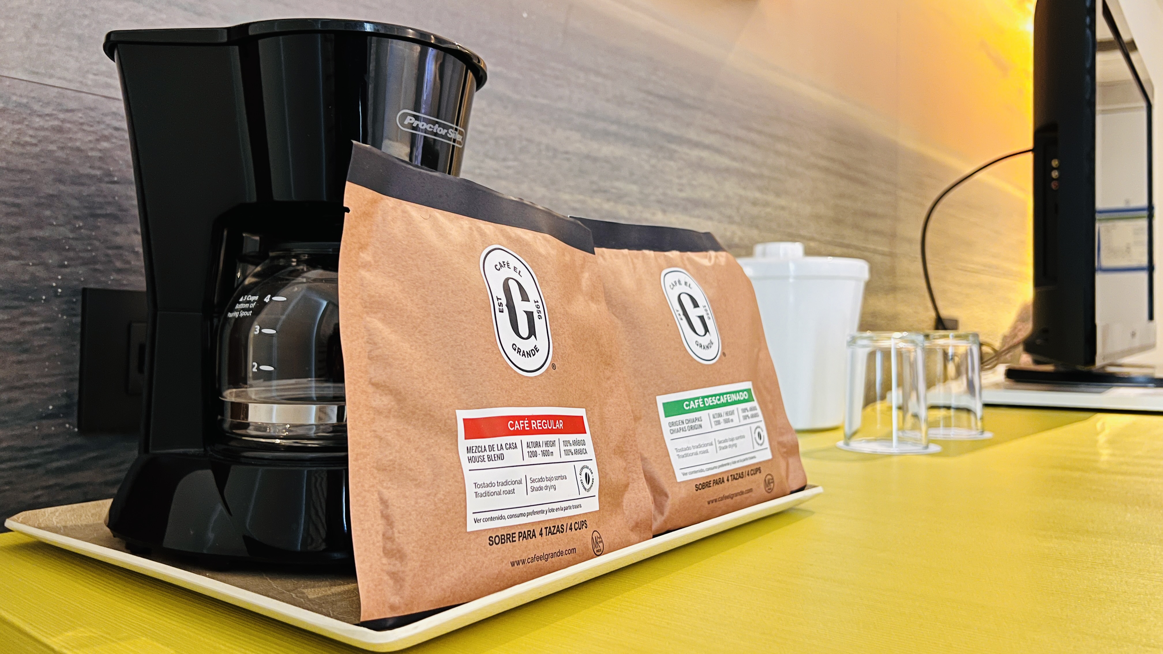 Encuentra café y agua disponibles sin costo para refrescarte o recargar energía en cualquier momento.